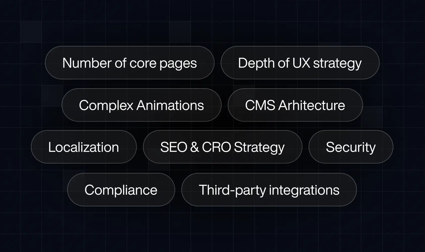 - Biggest cost drivers: product complexity, UX strategy, integrations, animations, CMS architecture, and content volume.